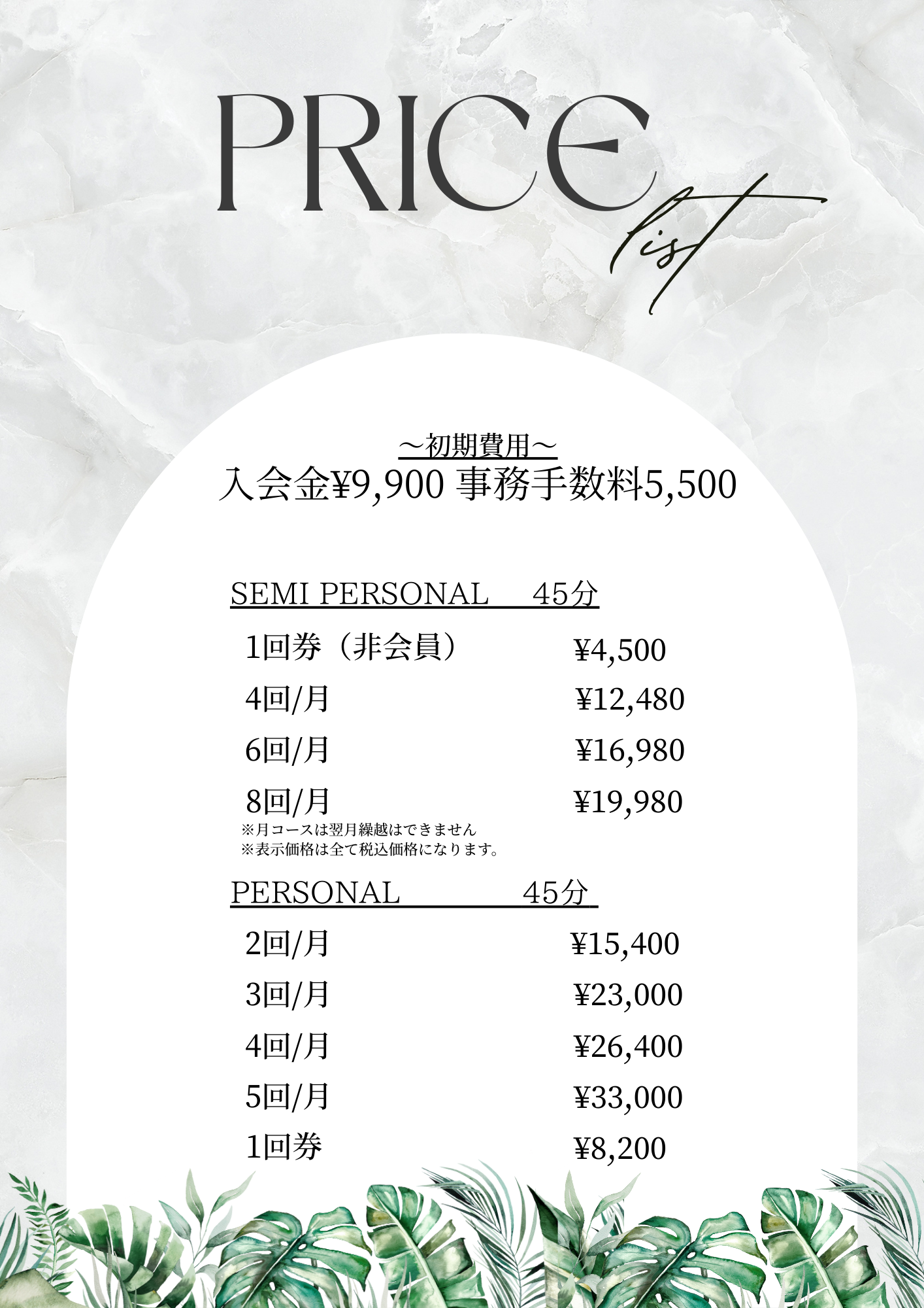 2025年7月以降にご入会されるお客様は以下の料金が適用となります。既存会員様はご契約時の内容、料金のままご利用いただけます。※詳細は体験時またはお問い合わせにてご案内いたします。